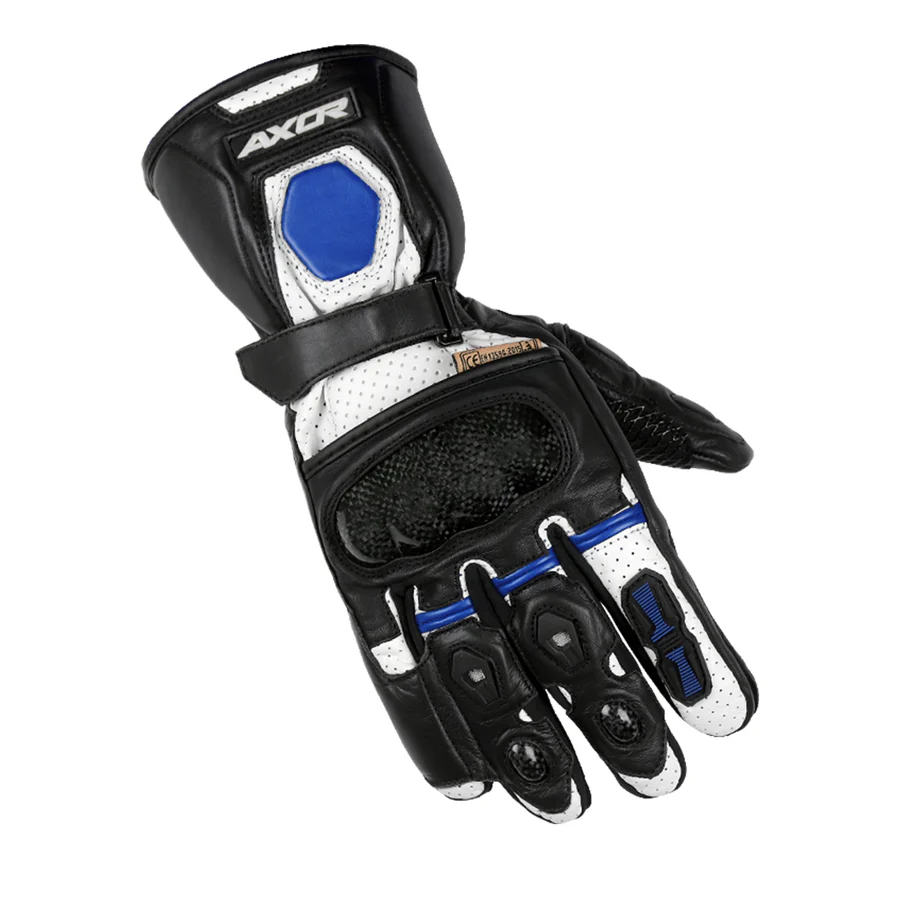 Designed for riders who demand uncompromising safety, precision control, and standout visibility, the Axor Lycan Riding Gloves Black Blue deliver a perfect blend of street comfort and track-inspired protection. Crafted from premium genuine goat leather and reinforced with carbon fiber armor, these CE-certified gloves ensure confidence on every ride—day or night.