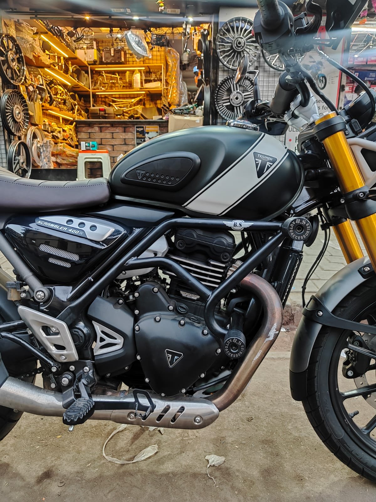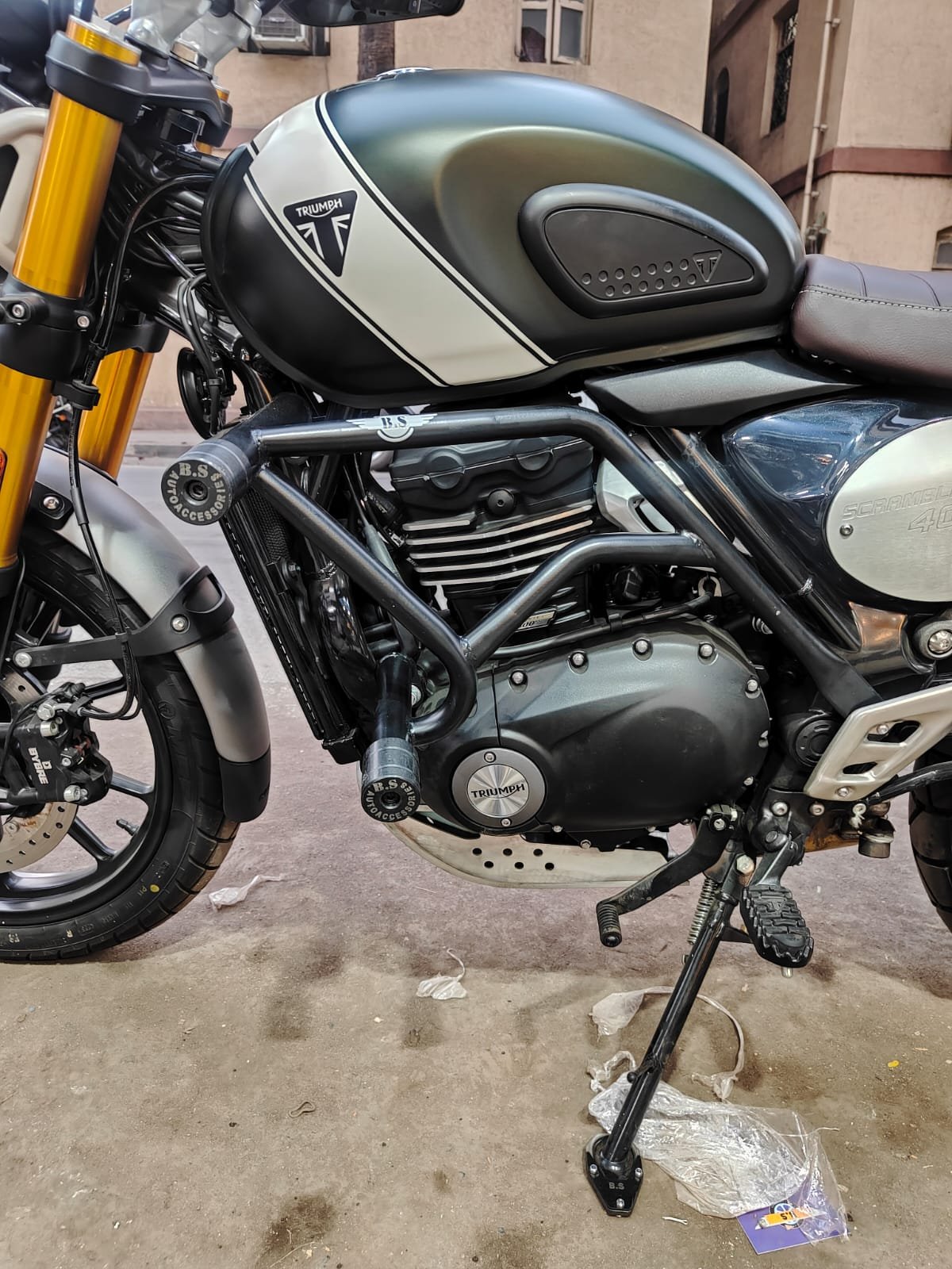 BS Auto Triumph Scrambler 400 X Crash Guard Black – Stainless Steel Protection with Dual Sliders