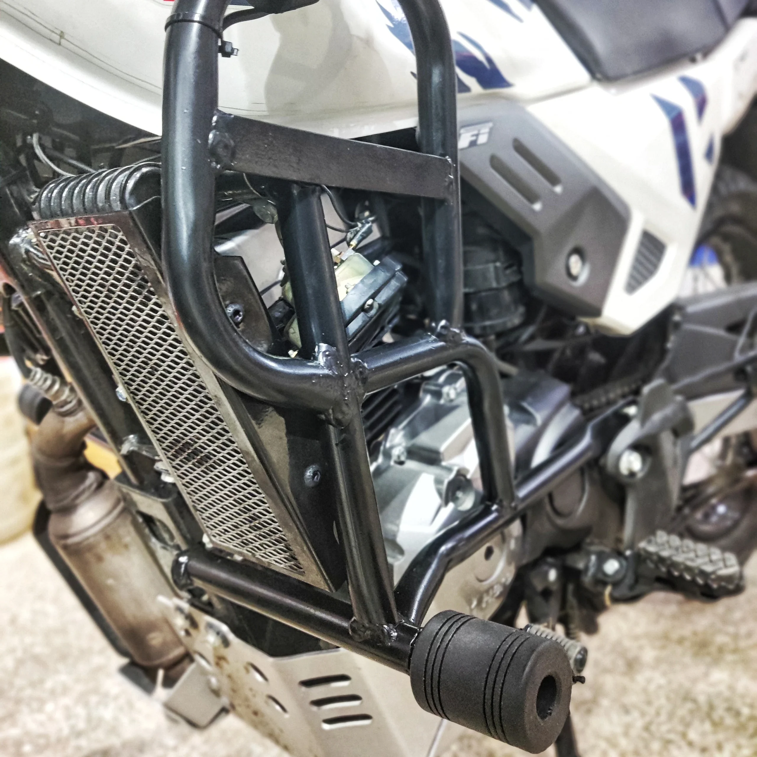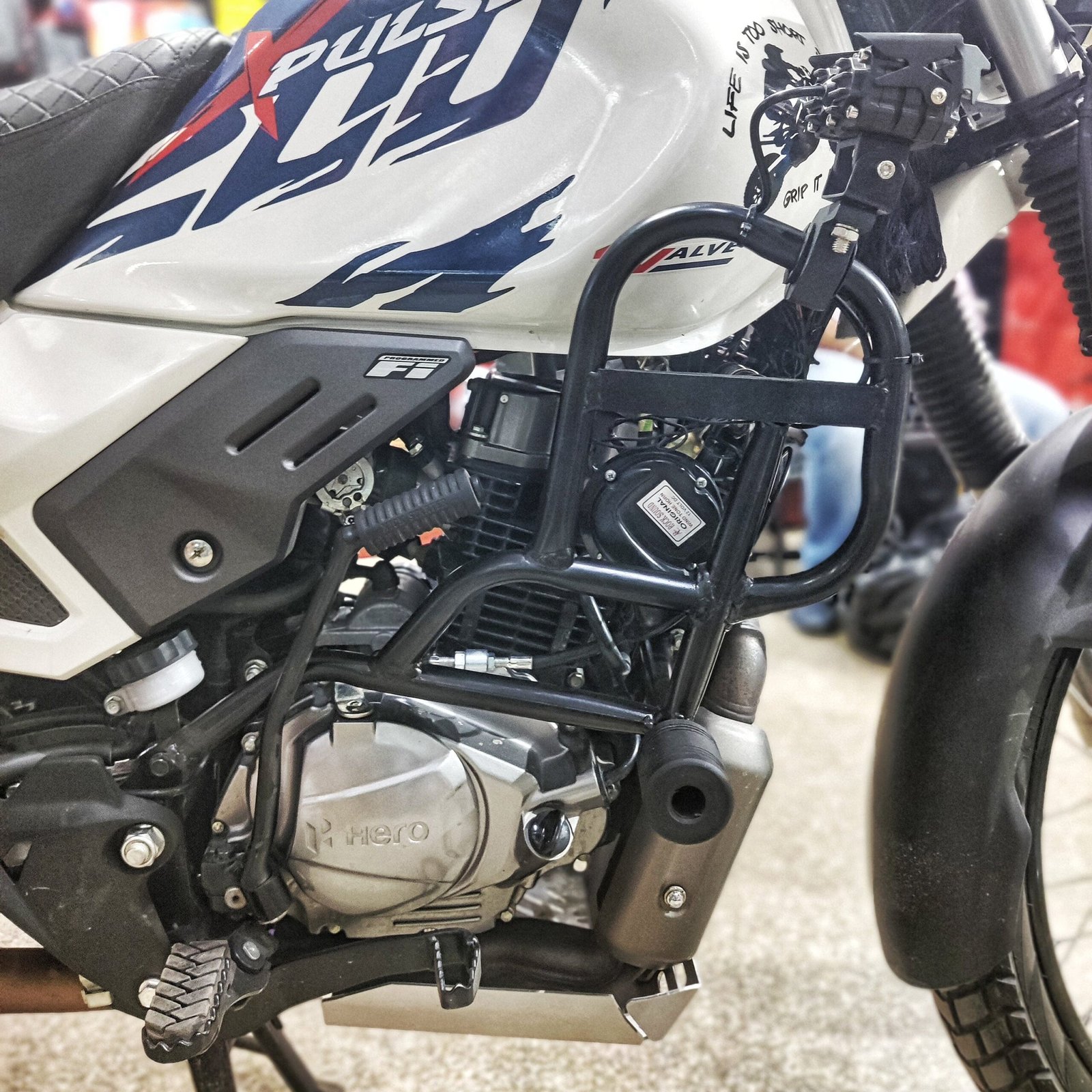 Heavy-duty crash guard with nylon sliders for XPulse 200/200T/4V. Protects engine, radiator & frame with 3-point stability.
