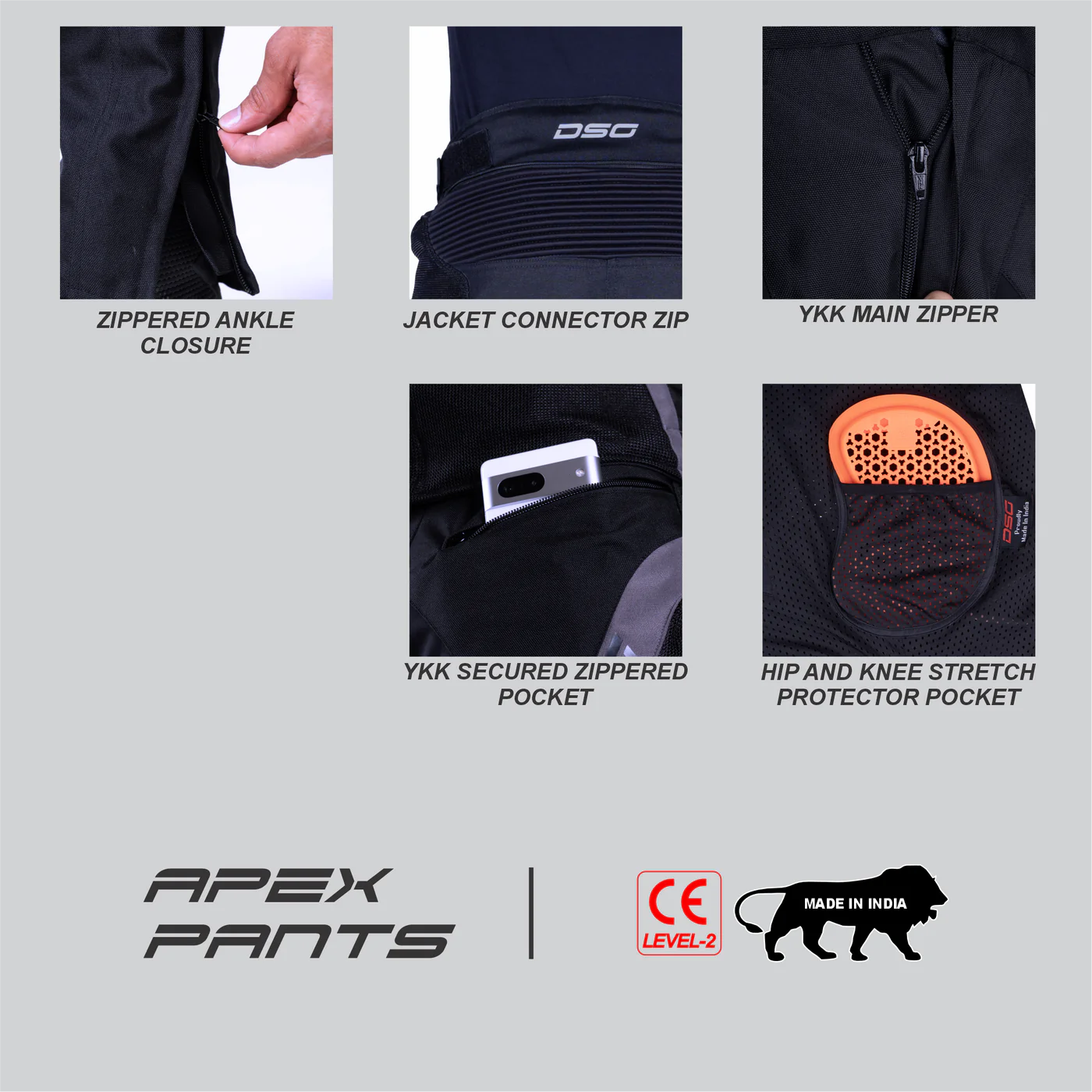 A: It comes with DSG Flexion CE Level 2 certified protectors at both hip and knee for high-impact safety.Q3. Can I wear these pants with my riding boots?