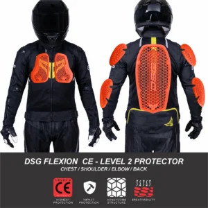 Top-Tier Impact Defense – Equipped with DSG Flexion CE Level 2 approved protectors at the shoulders, elbows, back, and divided chest inserts for full-body protection.
