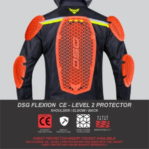 Impact Shields – DSG FLEXION CE Level 2 protectors on shoulders, elbows, and back.