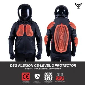 CE Level 2 Impact Protection – Equipped with external pockets holding DSG Flexion CE Level 2 protectors for the back, shoulders, elbows, and chest.