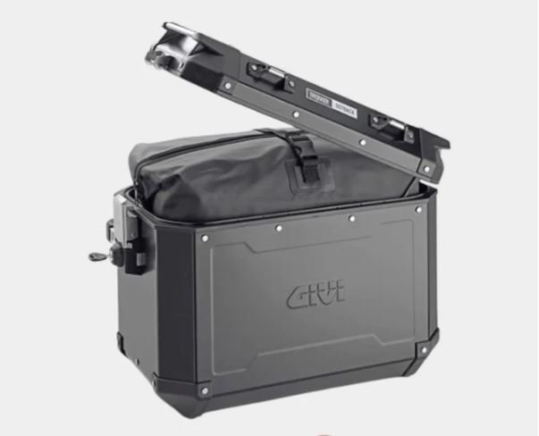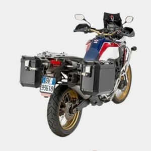Heavy-duty 48L Givi Outback Side Cases with aluminum body, Monokey CAM-SIDE mount, and matching locks.