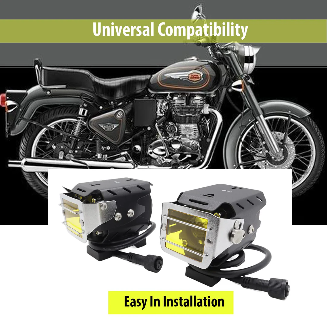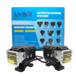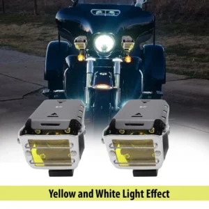 HJG-111 Fog Light Universal Motorcycle Dual Color Led Fog Light With Wiring Kit Wiring Harness+ Fuse +Switch+ Relay + Strobe Flasher for Two Led Work Fog Light Plug N Play System ( 90W)(10-80V DC) · Flux: 4500LMX · Environment Temperature: -40~85 cent degree· Range: 400m · Material: Aluminum Alloy · LED Bulb: 4500LMX U.S. Imported LED · Weight: 1200g. 5-1,00,000 hours life, at least 15 times in the xenon lamp.