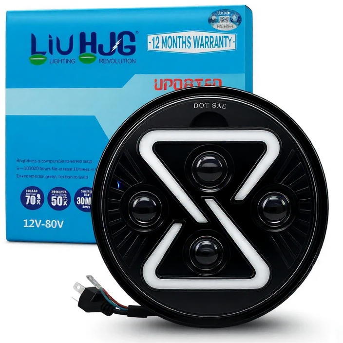 HJG 7 Inch animated LED headlight with Z-shape DRL, 75–120W power, plug & play fit for Royal Enfield and Thar.