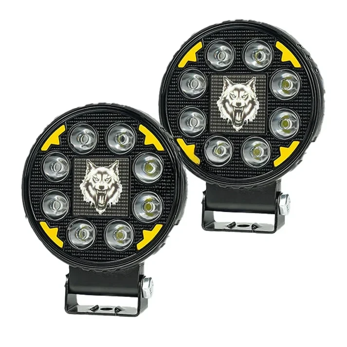 Powerful HJG Wolf 8 LED fog lights with white beam & red DRL, waterproof design, and universal fit for bikes and cars.
