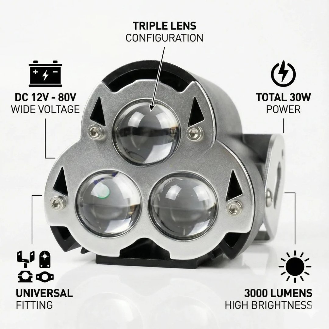 Designed for riders and drivers who demand maximum visibility in every condition, the HJG G15 Dragon Triple Lens LED Fog Light delivers ultra-wide illumination, multiple lighting modes, and rugged durability. Whether you’re riding through fog, rain, highways, or off-road terrain, this fog light ensures clarity, safety, and aggressive styling.