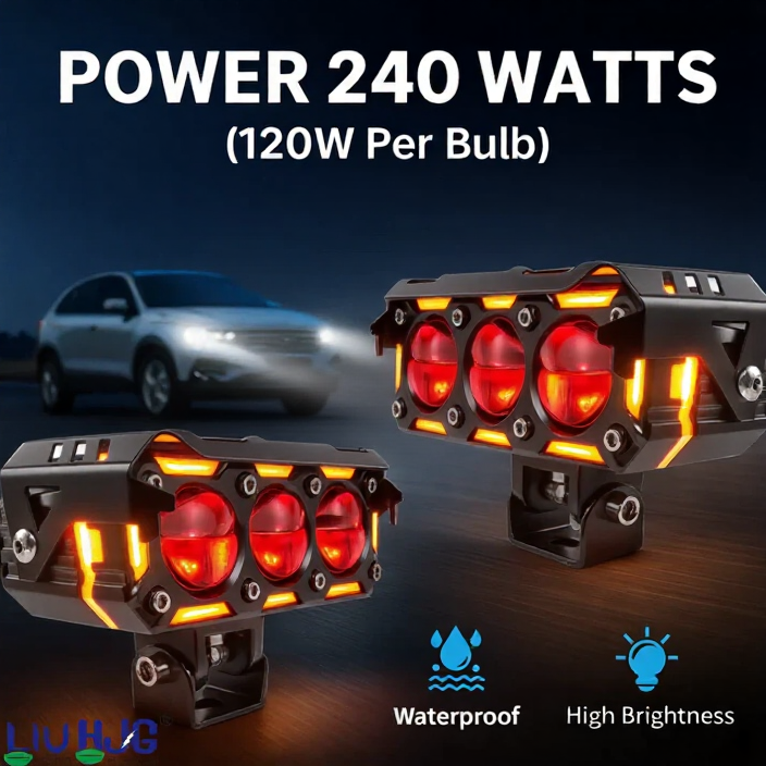 Ultra-bright 240W HJG 3-lens projector fog lights with white/yellow beams, red devil eye, amber ring DRL, waterproof design, and universal fit for cars & bikes.