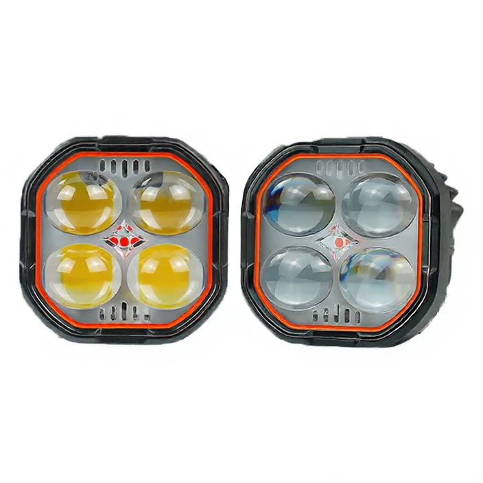 High-performance 80W HJG LIU 4×4 projector fog lights with red DRL, dual-color beams, wide throw, and universal fitment for cars & bikes.