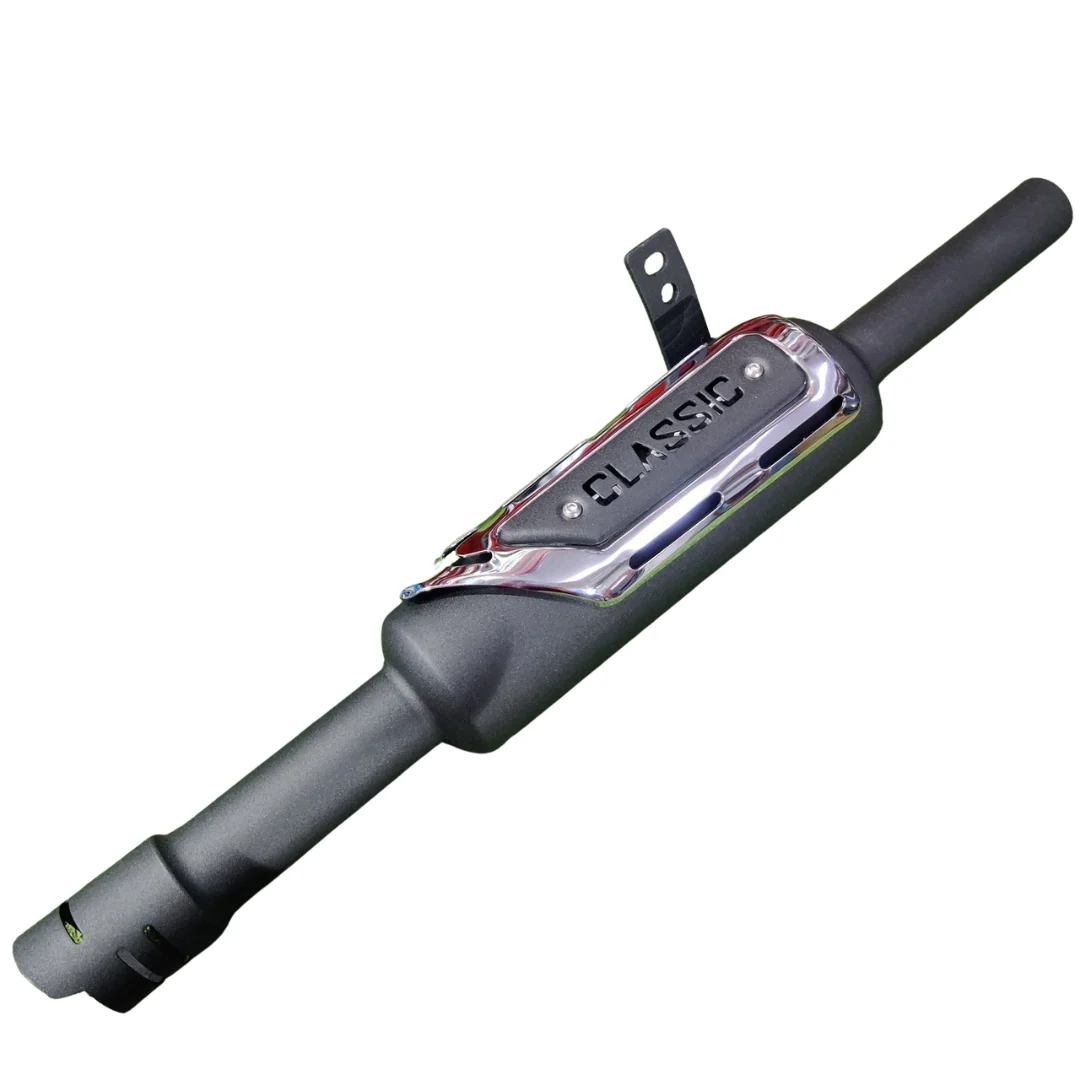Stylish black exhaust with plate for Royal Enfield. Universal fit, durable build & deep exhaust sound.