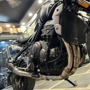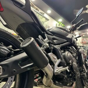 Race-Inspired Design: Matte black stainless steel finish complements the Triumph’s aesthetic, giving it an aggressive, premium look.