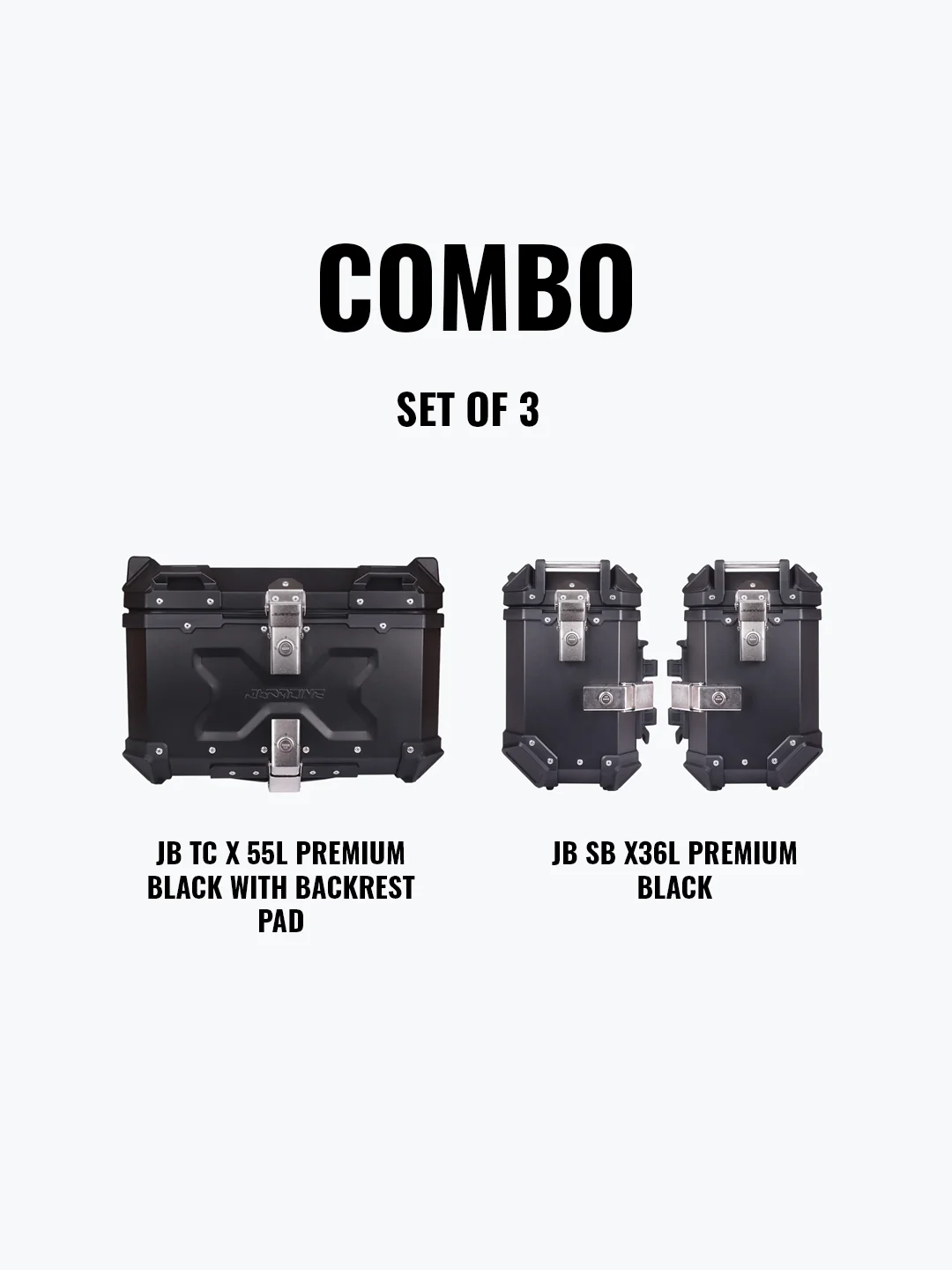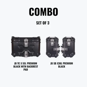 JB Racing Set of 3 Combo – Top Case X55L Premium Black with Backrest Pad + Side Box X36L Premium Black – Premium Motorcycle Storage & Style