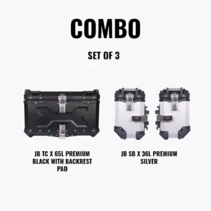 Upgrade your motorcycle storage with the JB Racing Set of 3 Combo, featuring the Top Case X 65L Premium Black with Backrest Pad and Side Box X 36L Premium Silver. Perfectly crafted for style, functionality, and maximum storage, this combo enhances your ride with durability, sleek design, and convenience. Ideal for riders seeking a high-capacity storage solution without compromising aesthetics.