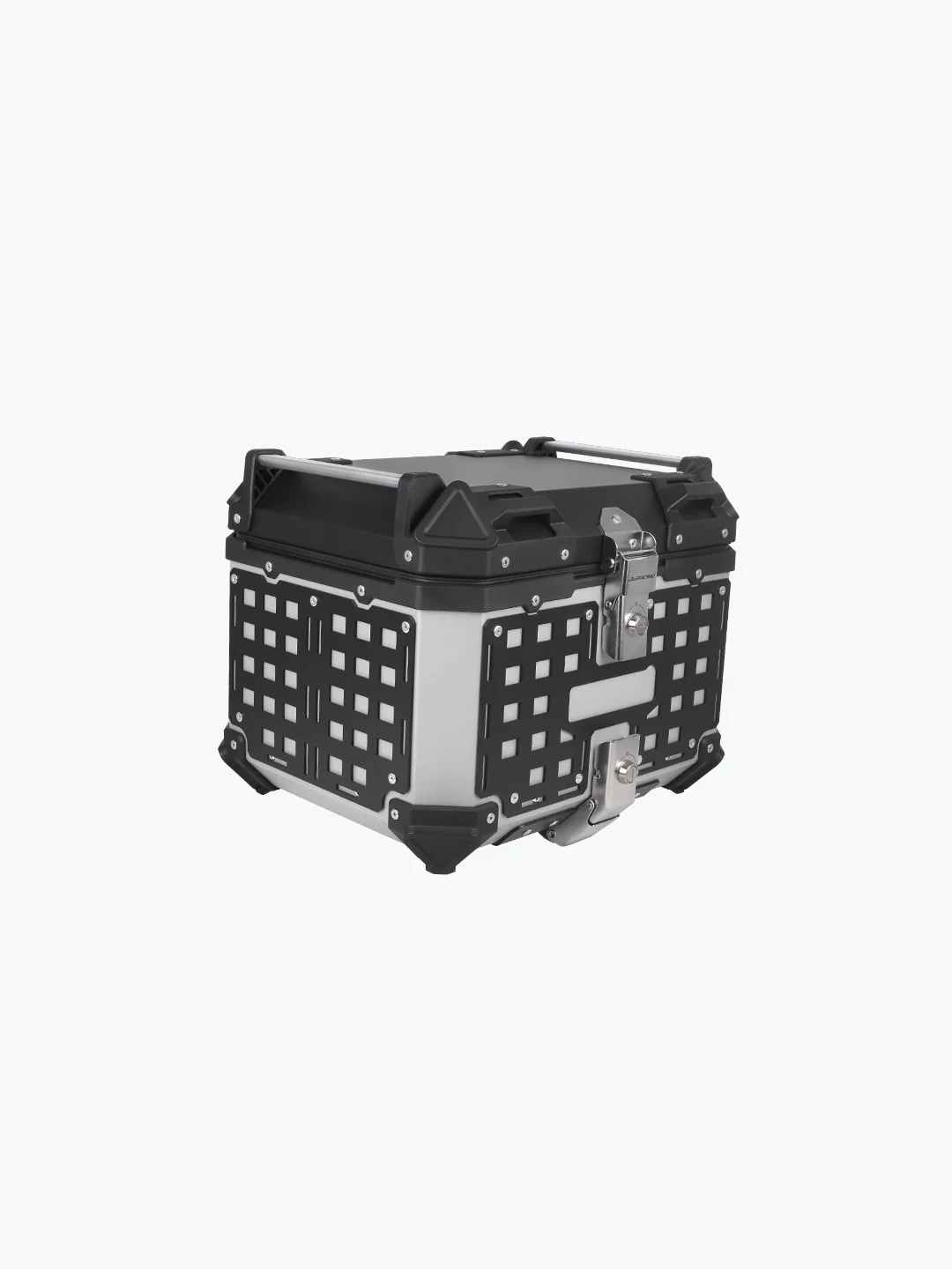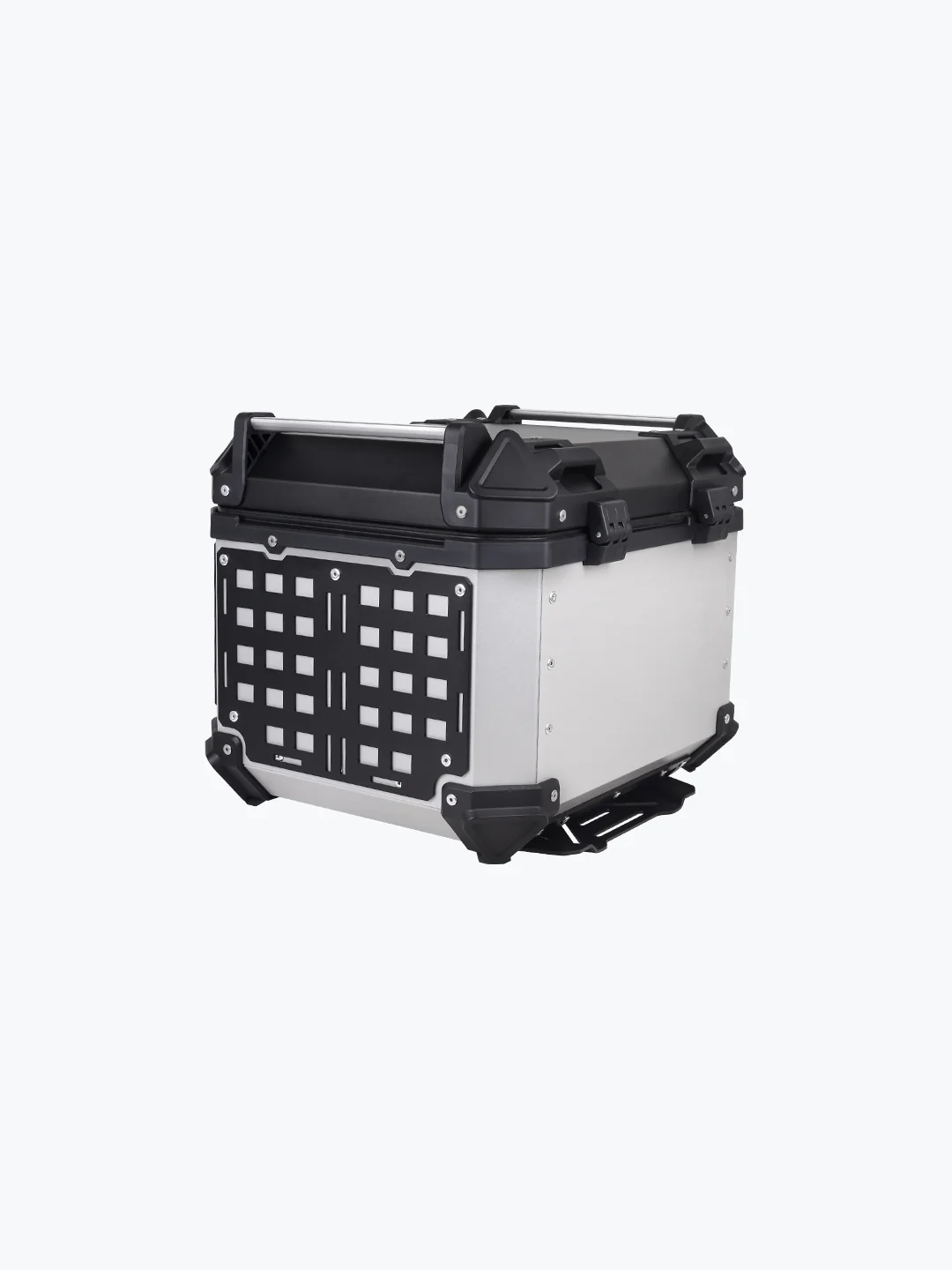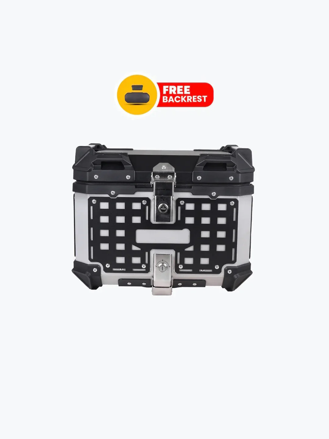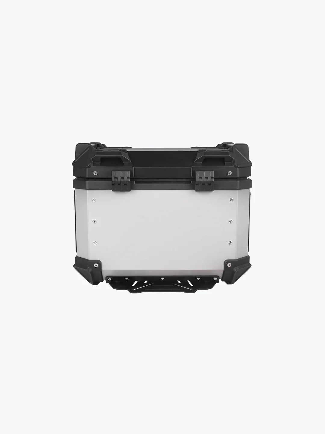 Spacious 45L top case with backrest pad, waterproof design, and sleek silver finish for all rides.