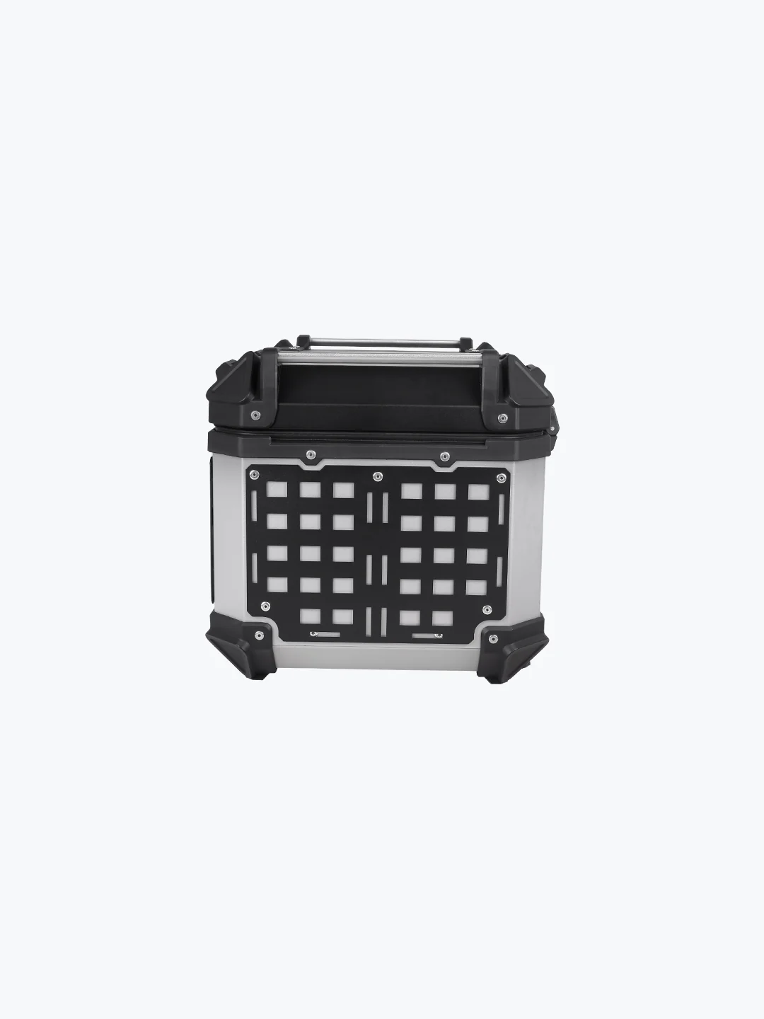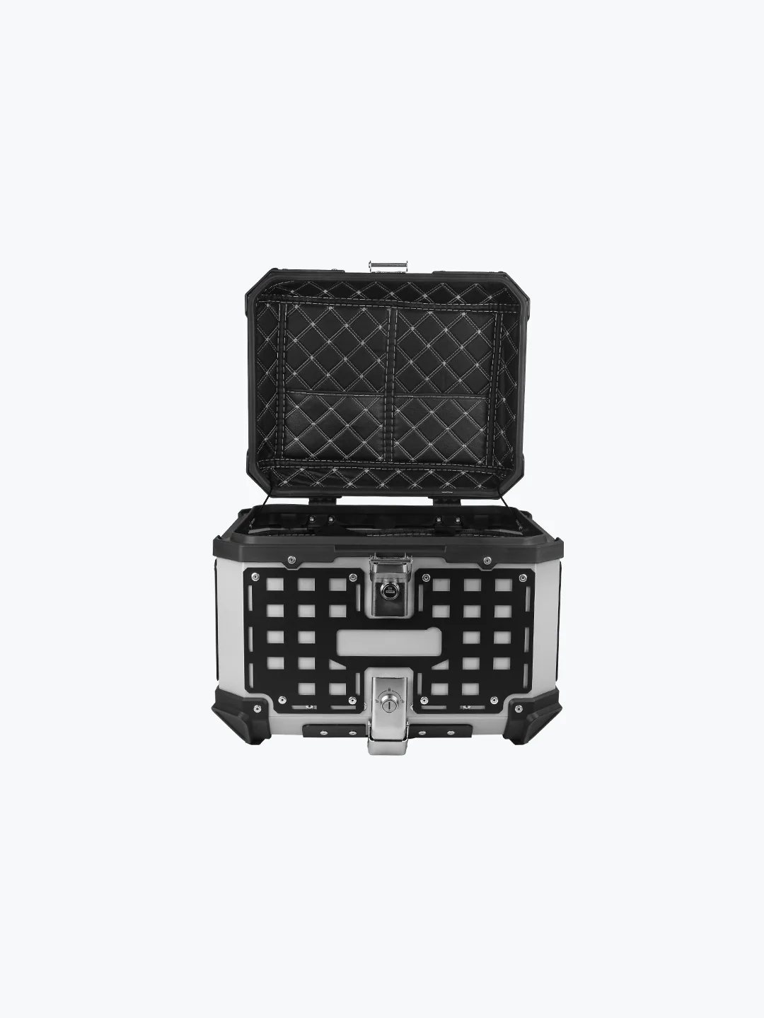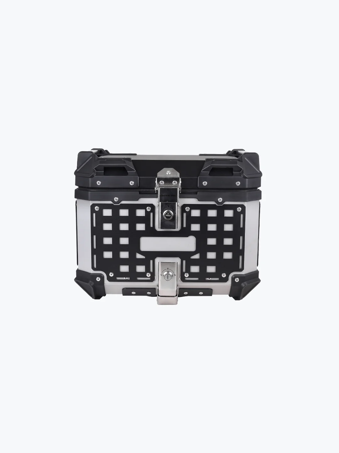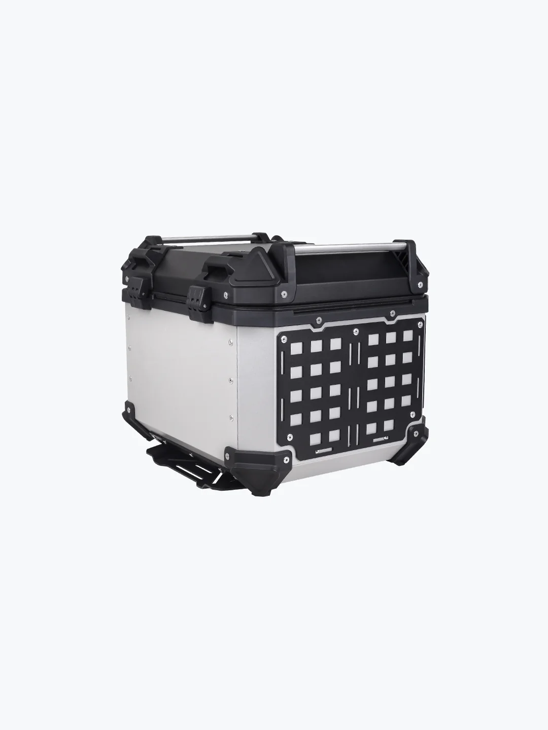 Spacious 45L top case with backrest pad, waterproof design, and sleek silver finish for all rides.