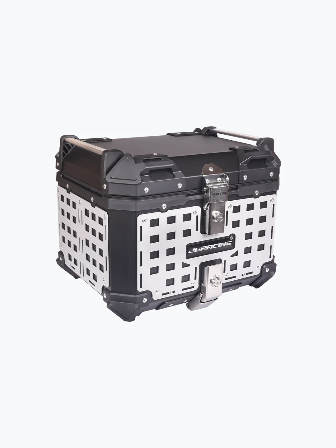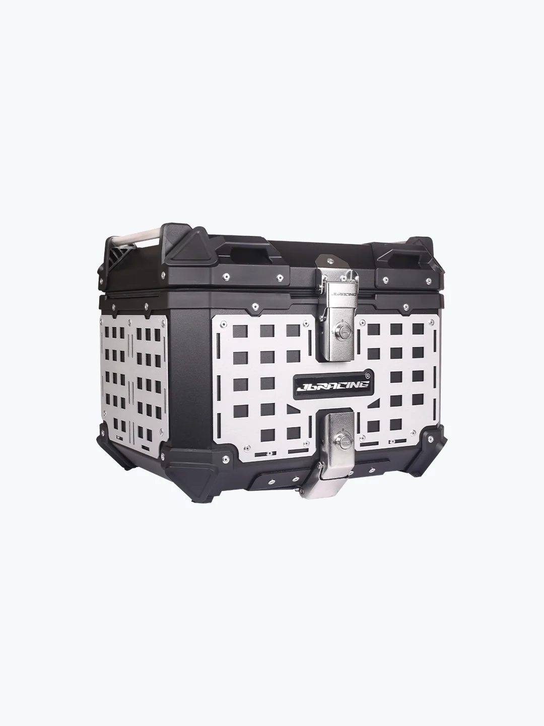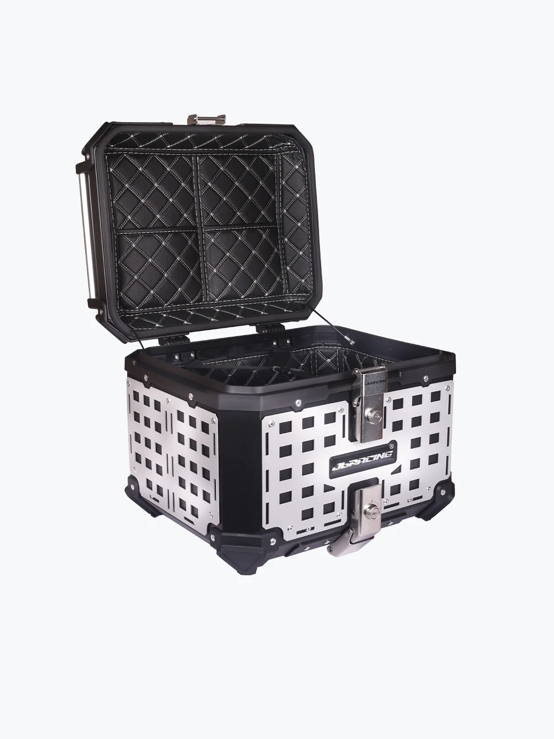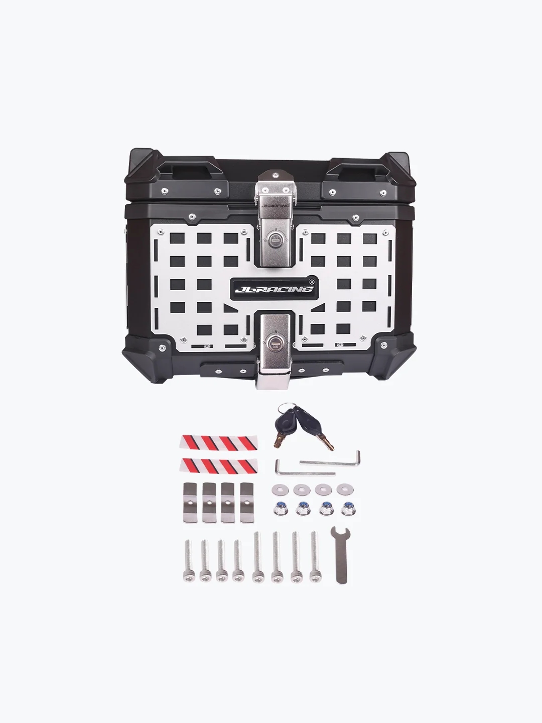 Spacious 45L JB Racing Top Case with 3D mesh ventilation, waterproof build & back rest pad for comfort.