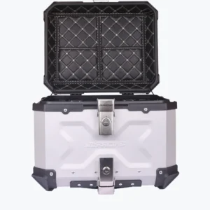 JB Racing 45L Silver Top Case with back rest pad – stylish, durable & universal fit for maximum comfort and storage.