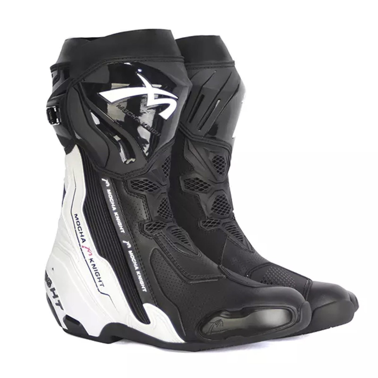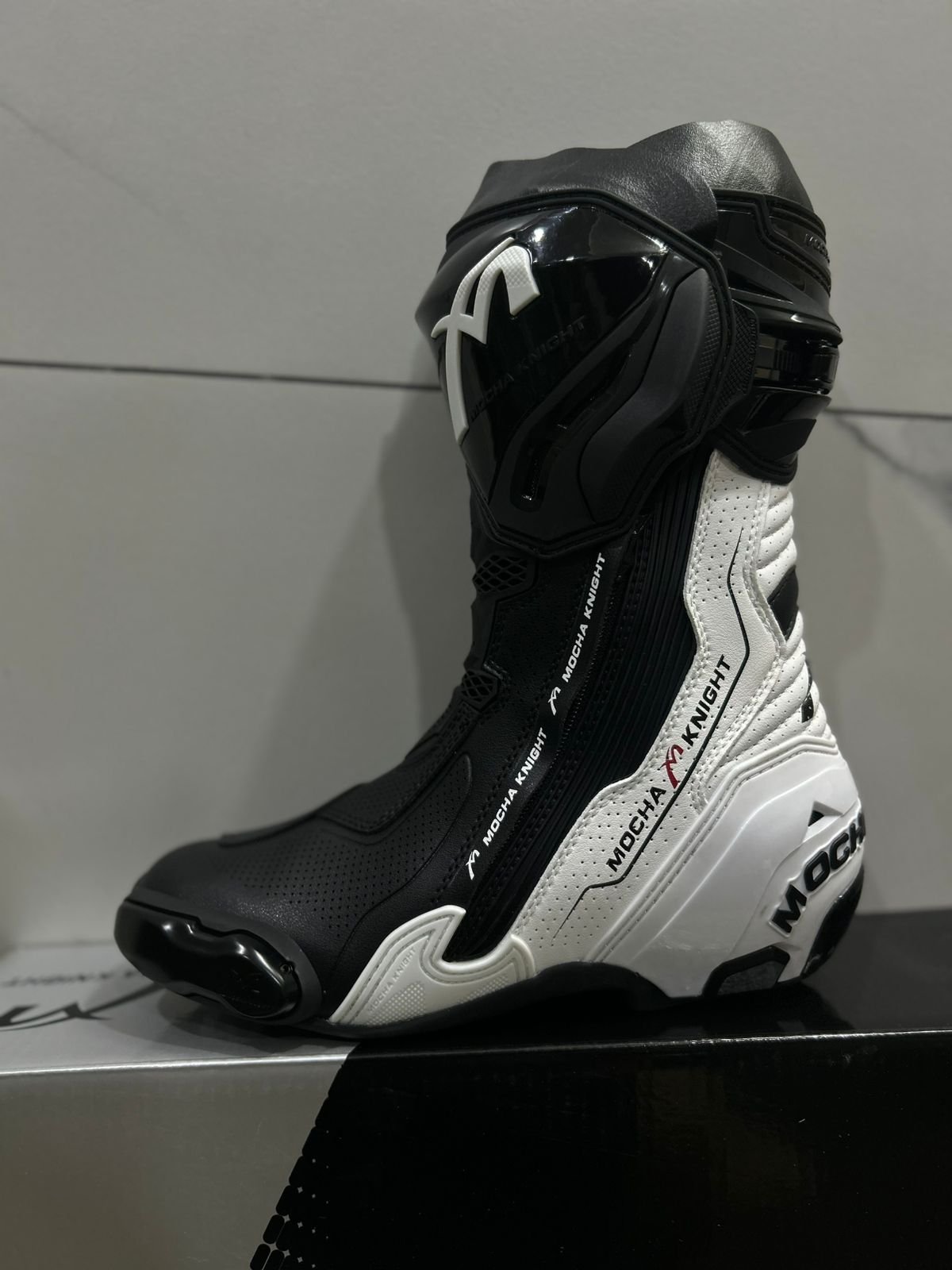 Mocha Knight Track Approved Motorcycle Riding Boot Black/White – Race-Ready Protection & Comfort