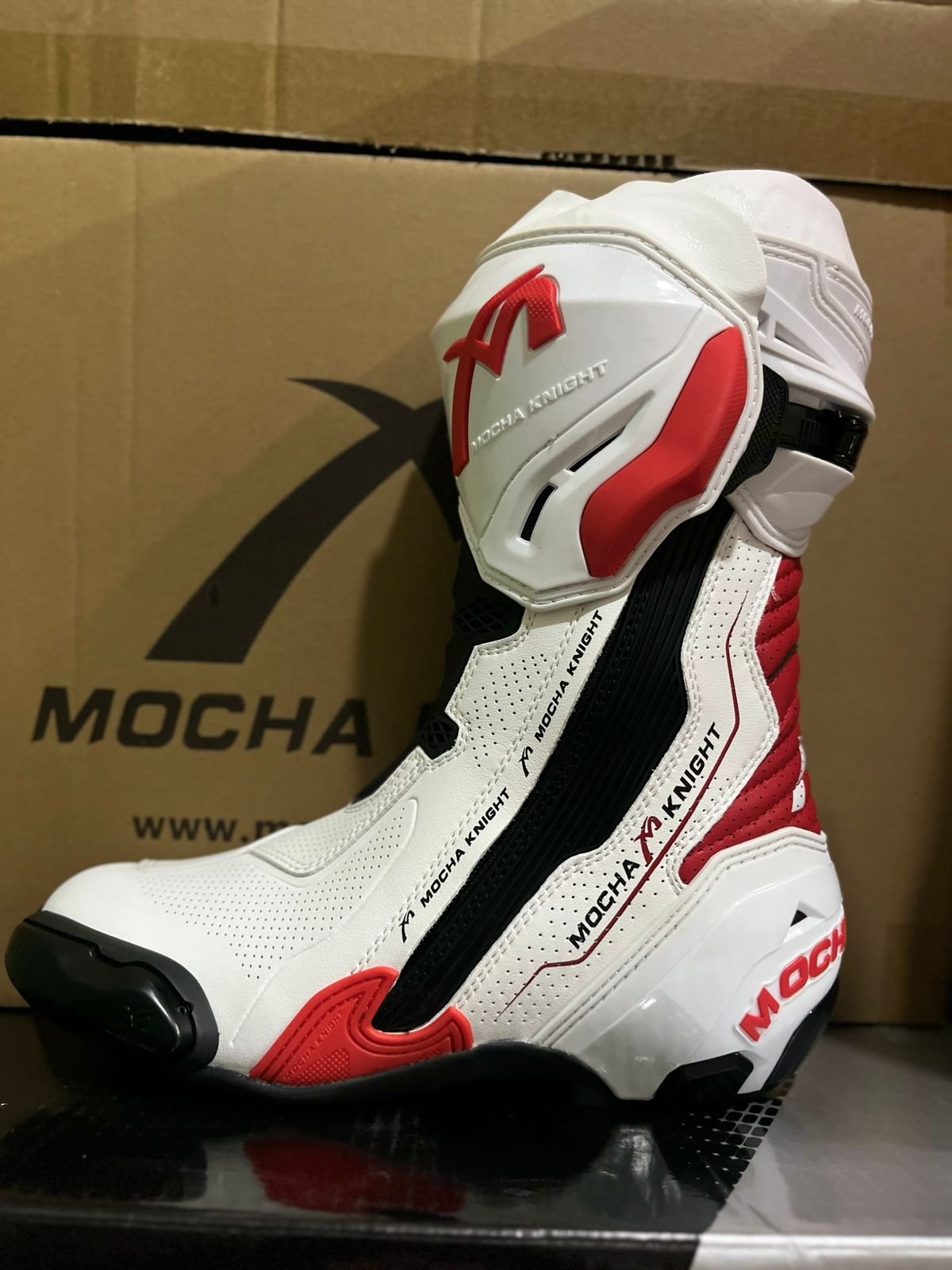 Mocha Knight Track Approved Motorcycle Riding Boot White/Red – Race-Ready Protection & Performance