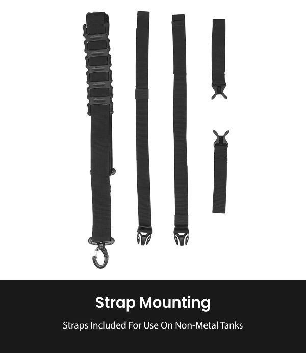 Strap Mounting – Includes quick-release and D-ring straps for non-metal tanks
