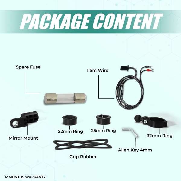 Complete Package – Includes holder, mounts, allen key, fuses, buckles, zip ties, warranty & thank-you card.