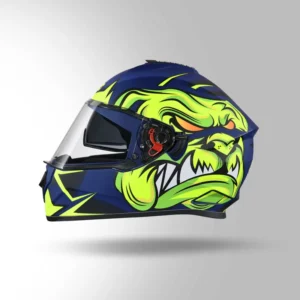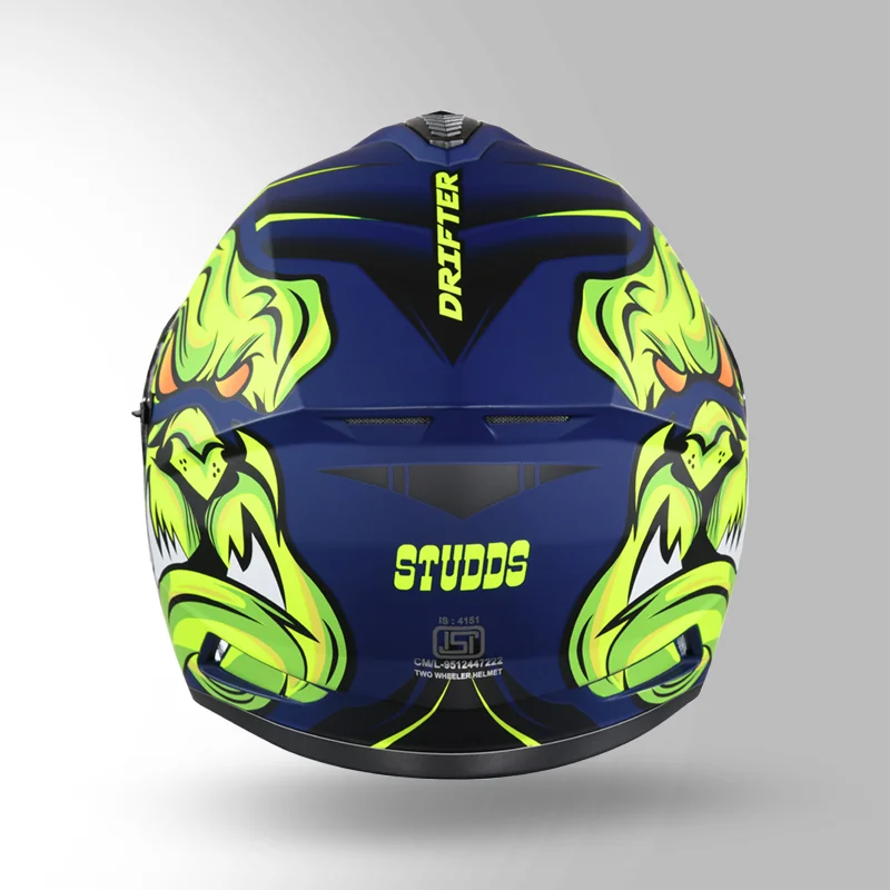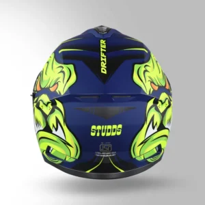 The STUDDS Drifter D1 Decor N5 Yellow Blue is a full-face helmet with a high-impact shell, regulated EPS, dynamic ventilation, and a dual visor system, offering reliable protection, comfort