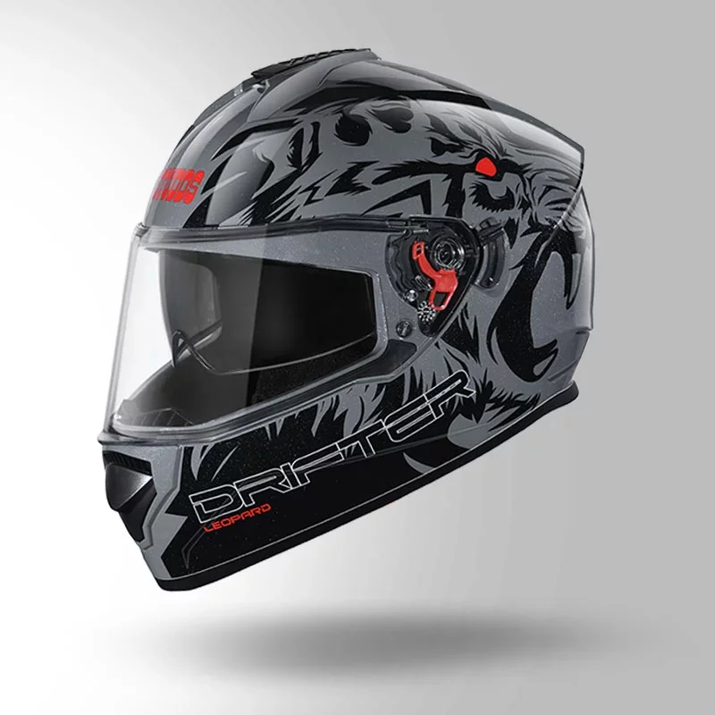 Drifter D2 Leopard Decor is a full-face helmet with a high-impact outer shell and UV-resistant paint along with product features like an aerodynamic design, regulated density EPS, dynamic ventilation system with chin and top air vents, and hot air exhausts, hypoallergenic and replaceable liner, removable and replaceable lower trim, silicone-coated dual visor with quick release chin strap. It also comes with a special dual visor lever. Drifter D2 Decor-Leopard series comes in various sizes and graphics options. To make it look more aggressive, each helmet comes with a matching spoiler. Install and flaunt it. Rule the road with the Drifter D2-Leopard series of helmets.