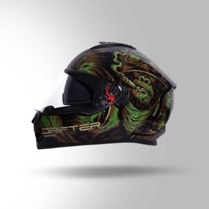 Drifter D3 Rampage Decor is a full-face helmet with a high-impact outer shell and UV resistant paint along with product features like an aerodynamic design, regulated density EPS, dynamic ventilation system with chin and top air vents and hot air exhausts, hypoallergenic and replaceable liner, removable and replaceable lower trim, silicone-coated dual visor with quick release chin strap. It also comes with a special dual visor lever. Drifter D3 Decor-Rampage series comes in various sizes and graphics options.To make it look more aggressive, each helmet comes with a matching spoiler. Install and flaunt it. Rule the road with Drifter D3-Rampage series of helmets.