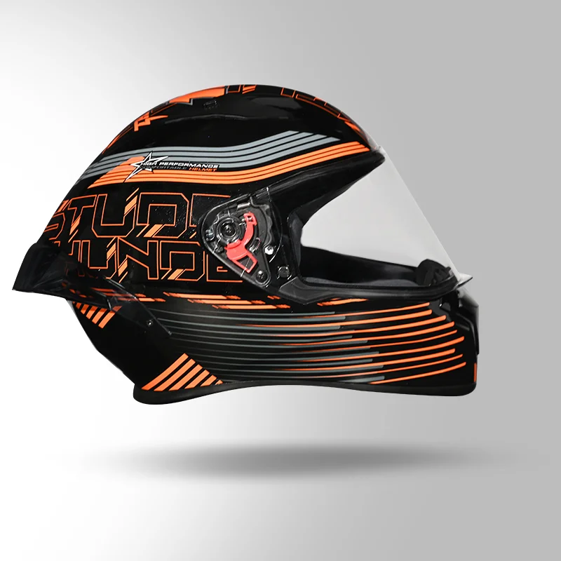 Studds Thunder D11 Helmet – full-face protection, quick-release visor, comfy liner, stylish black-orange design.