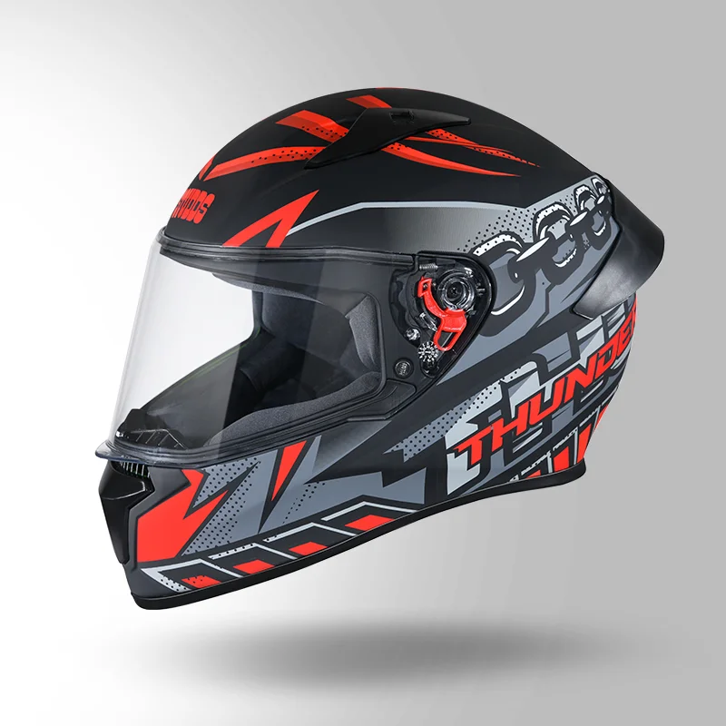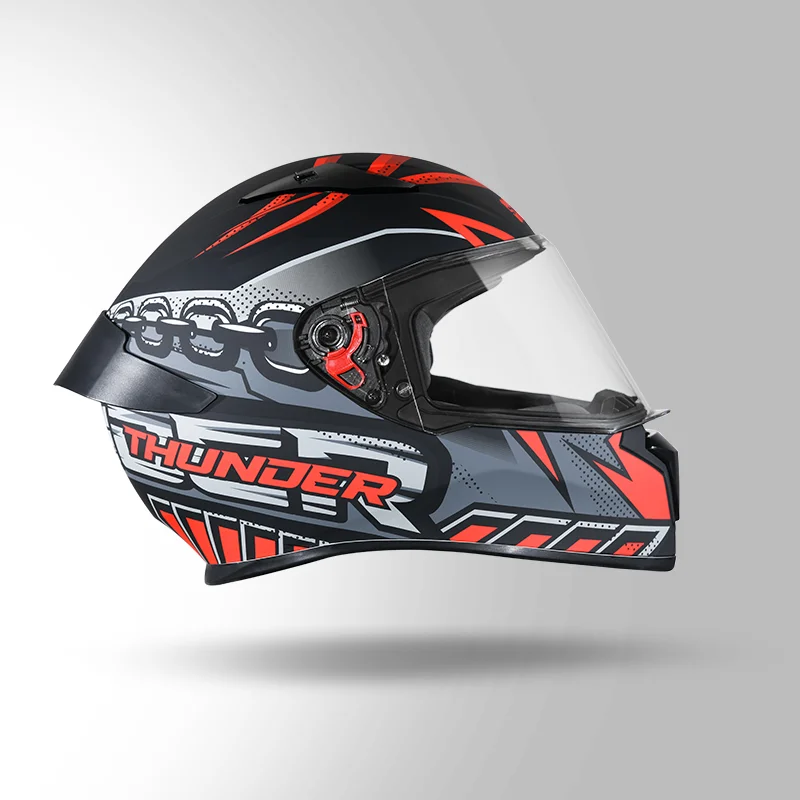 Thunder D5 Decor is a full face helmet with spoiler and product features like aerodynamic design with high impact outer shell, regulated density EPS, dynamic ventilation system, hypoallergenic liner, replaceable liner, quick release visor and quick release chin strap. Thunder D5 Decor with spoiler is available in various sizes, graphics and decal options.