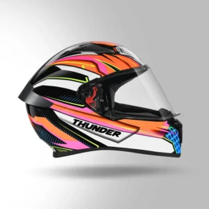 Thunder D8 Decor is a full-face helmet with quick release spoiler and other product features like aerodynamic design, higher impact outer shell with UV resistant paint, regulated density EPS, dynamic ventilation system having air vents at top and chin area with hot air exhausts at the back, hypoallergenic and replaceable liner and quick release chin strap. Thunder D8 Decor with spoiler is available in various sizes and colour options.