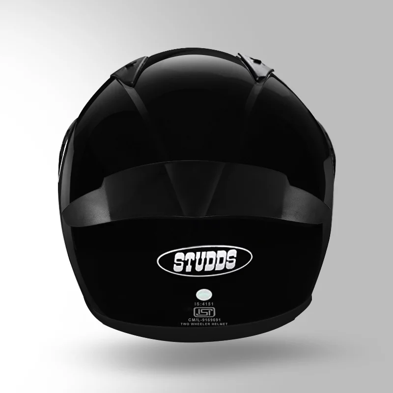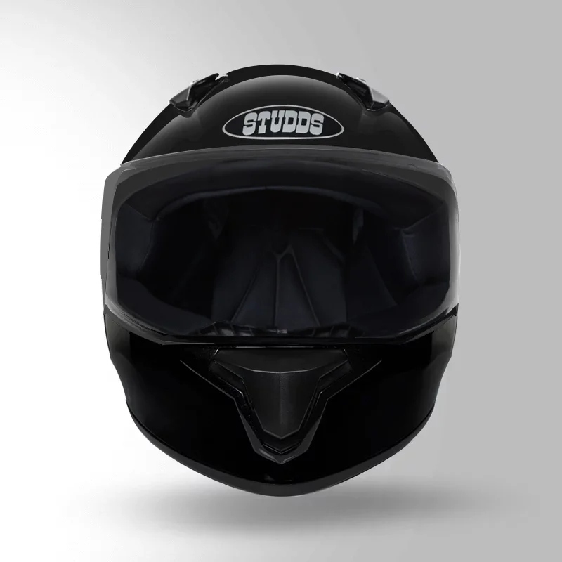 STUDDS Thunder Solid Helmet combines high-impact protection, aerodynamic design, and maximum comfort. Features include a quick-release visor, replaceable hypoallergenic liner, dynamic ventilation, and a sporty glossy black finish with spoiler.