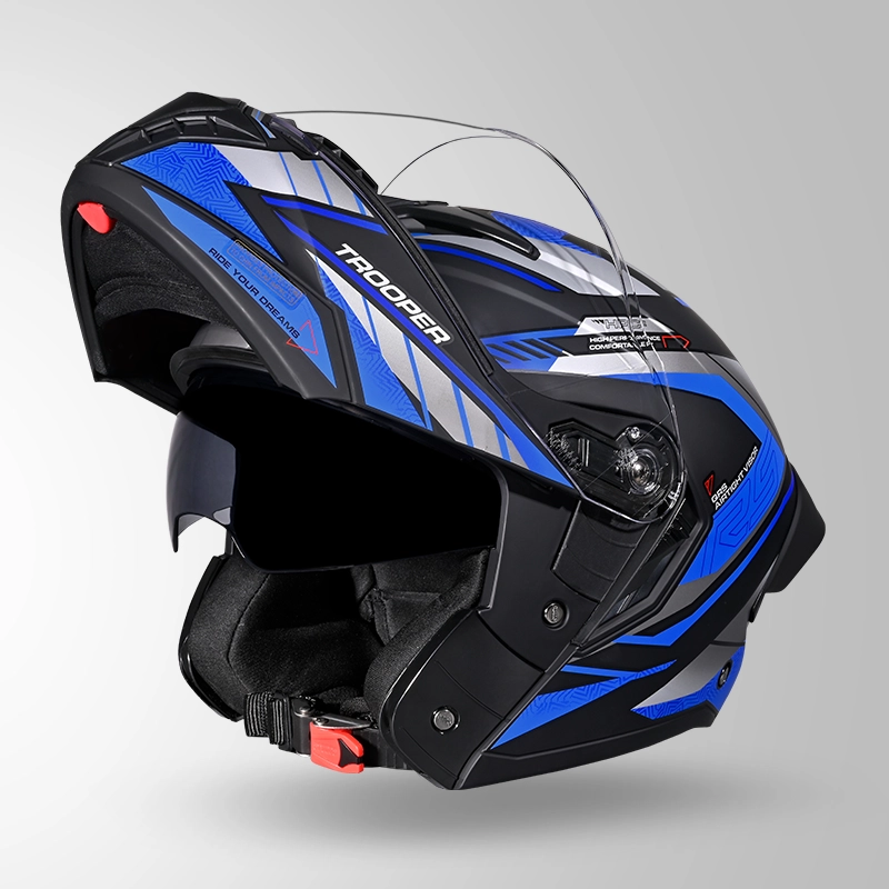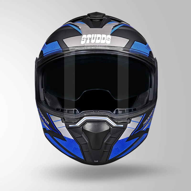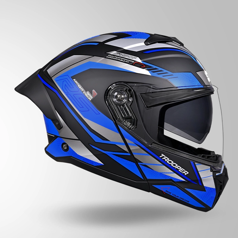 Stylish and safe, the STUDDS Trooper D4 Race Helmet features a flip-up design, dual visors, and dynamic ventilation.