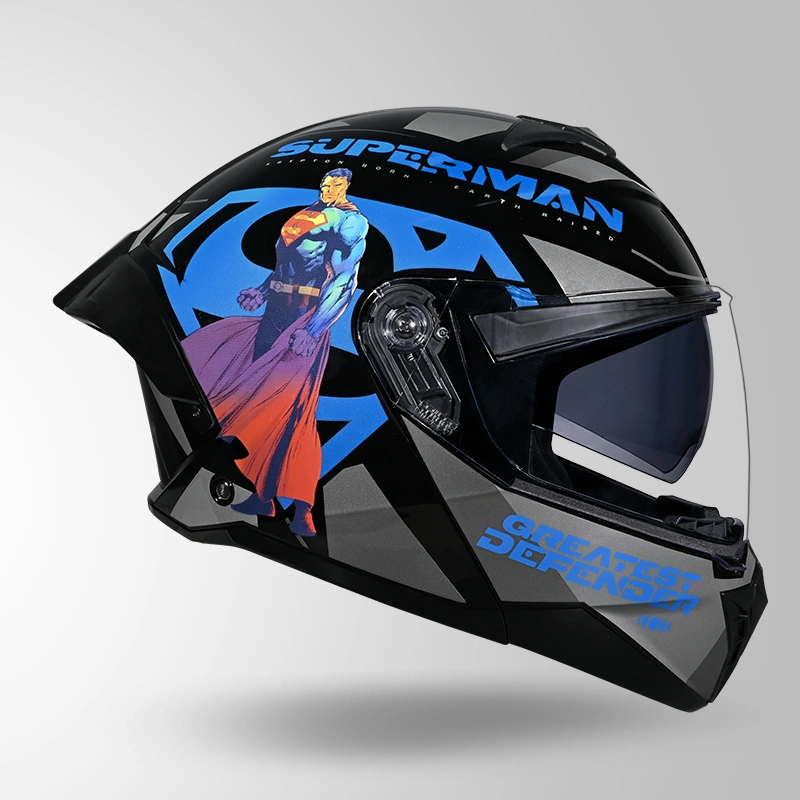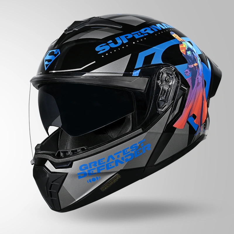 Inspired by the legendary superhero, the STUDDS Trooper Superman Edition Helmet blends iconic design with everyday riding safety. Featuring striking Superman-themed graphics in black and blue, this helmet is perfect for riders who want to stand out on the road while enjoying reliable protection. The convenient flip-up design allows easy use during city commutes and long rides, giving the helmet both practicality and a premium modern look.