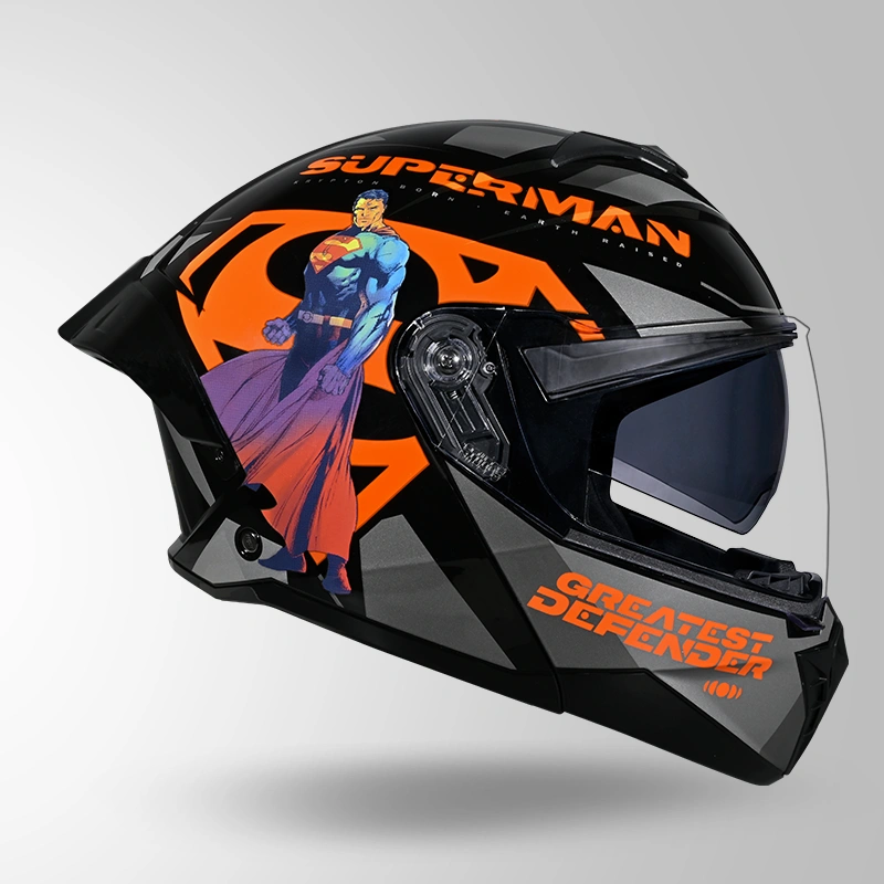 Inspired by the iconic superhero, the STUDDS Trooper Superman Edition Helmet combines powerful design with everyday riding practicality. Featuring striking Superman-themed graphics in a bold black and orange color scheme, this flip-up helmet is perfect for riders who want to stand out while enjoying reliable protection and comfort on every ride.