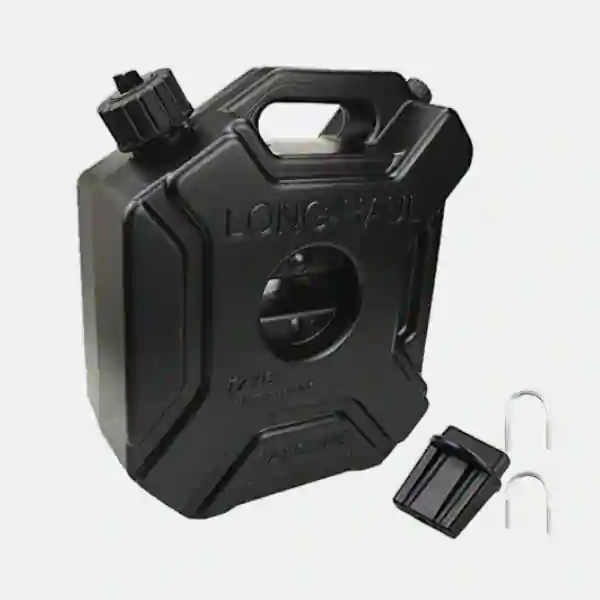 Lockable 5L petrol jerry can for motorcycles. Compact, leak-proof, ideal for touring & emergency fuel storage.