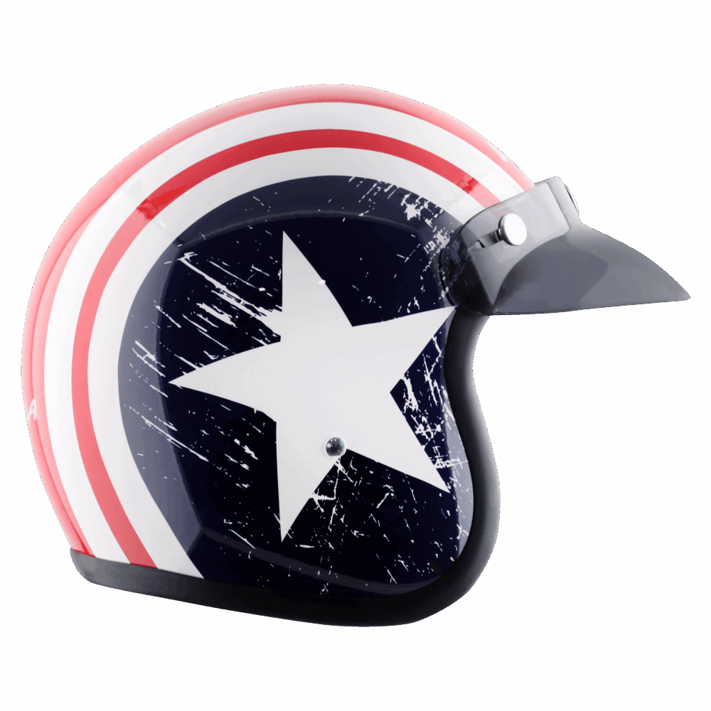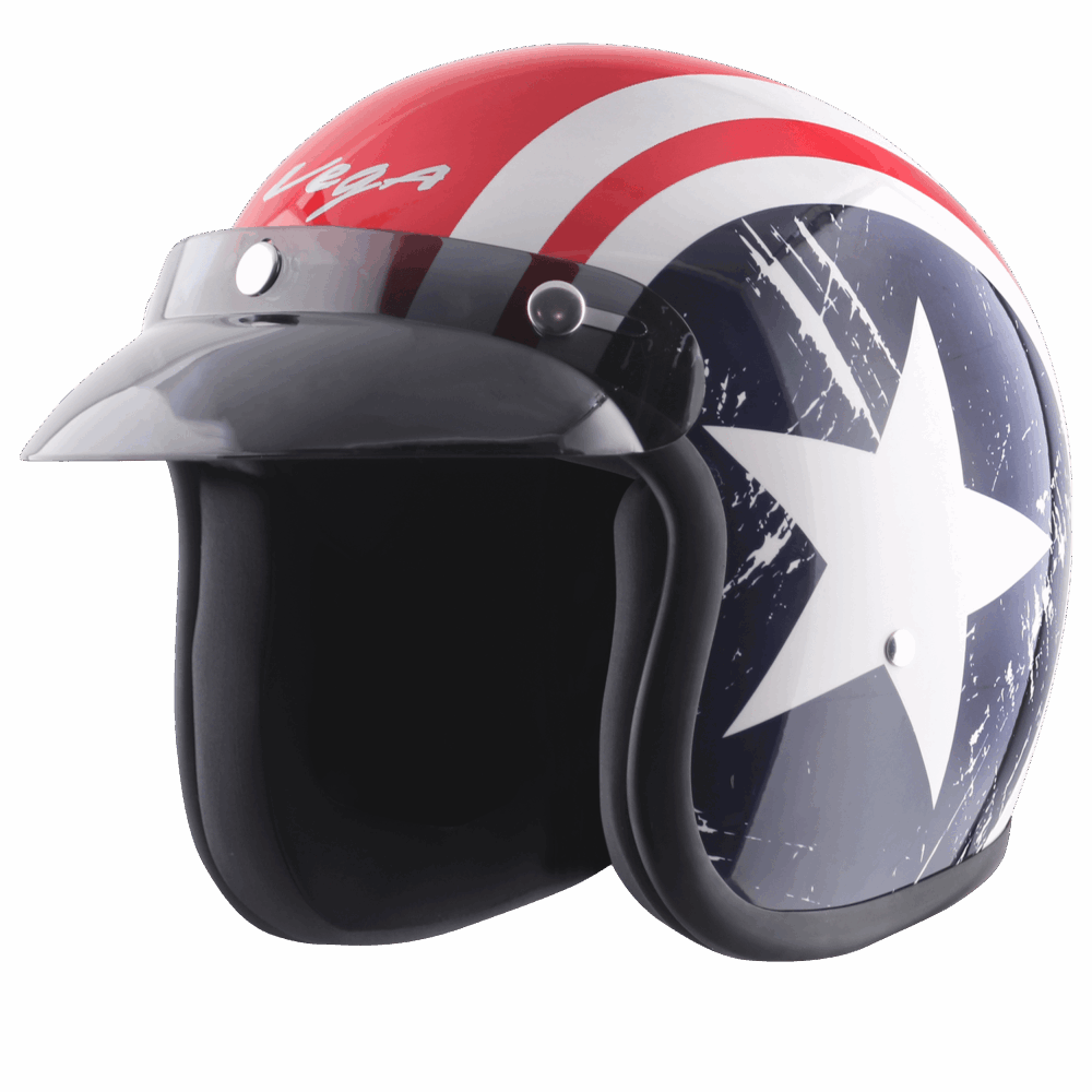 Designed for riders who love vibrant graphics and urban style, the Vega Jet With Peak Captain Helmet blends bold aesthetics with practical functionality. Its standout star-themed metallic design adds a striking shine to your summer rides, while the open-face structure with a peak visor lets you wear sunglasses with ease and elevate your style on the go.