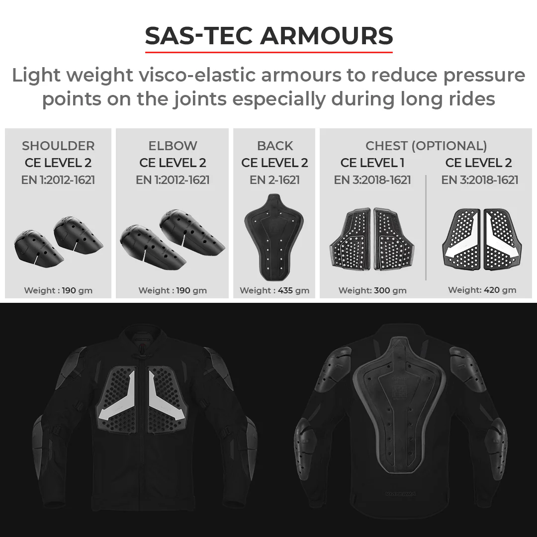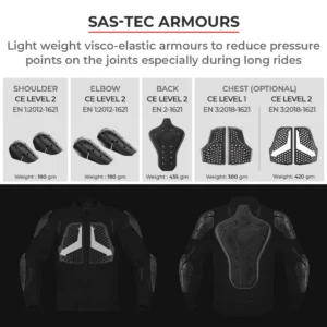 ● SAS-TEC CE Level 2 Armour – Includes shoulder, elbow, and back protectors with maximum coverage for high-impact zones. Optional chest protector upgrade available (Level 1/Level 2).