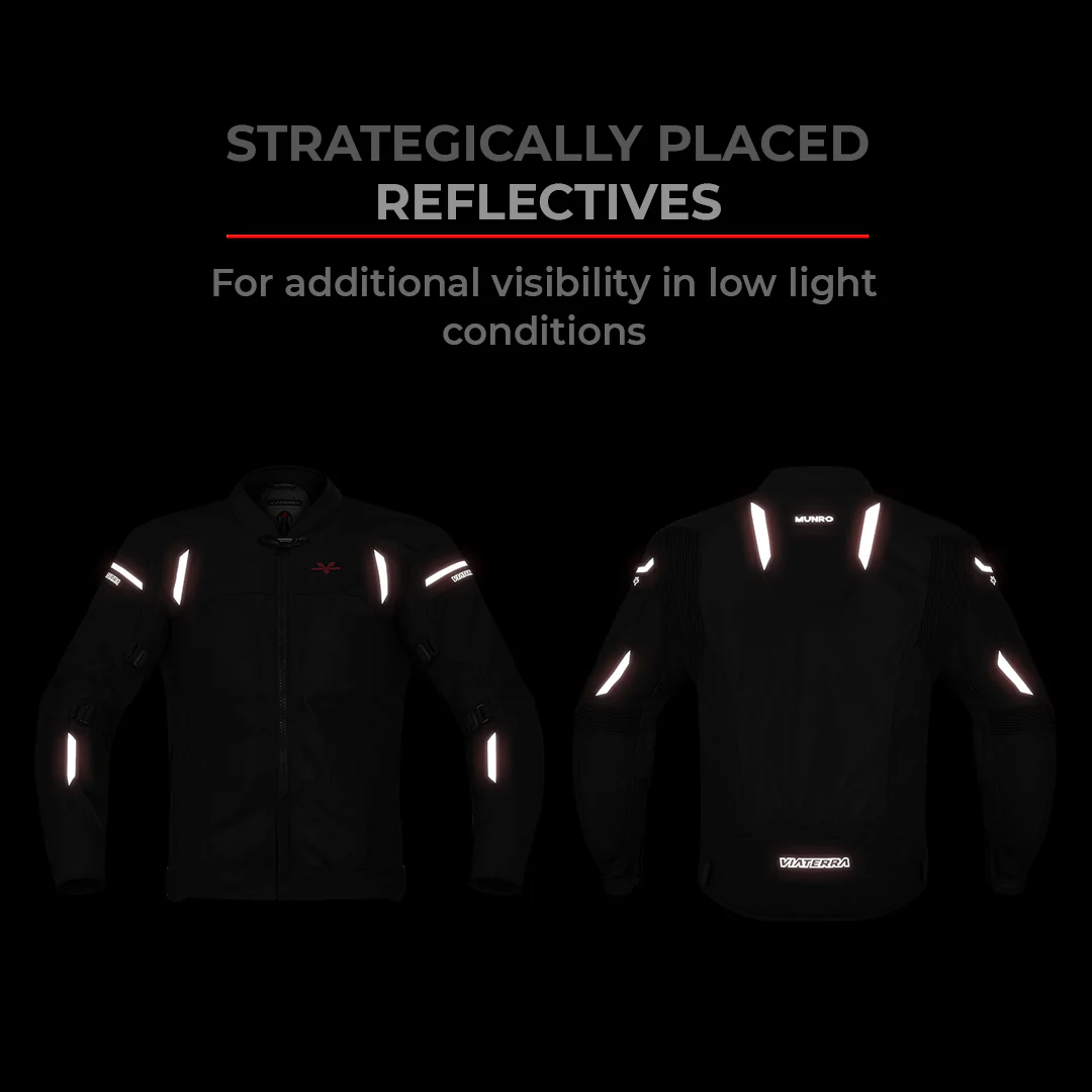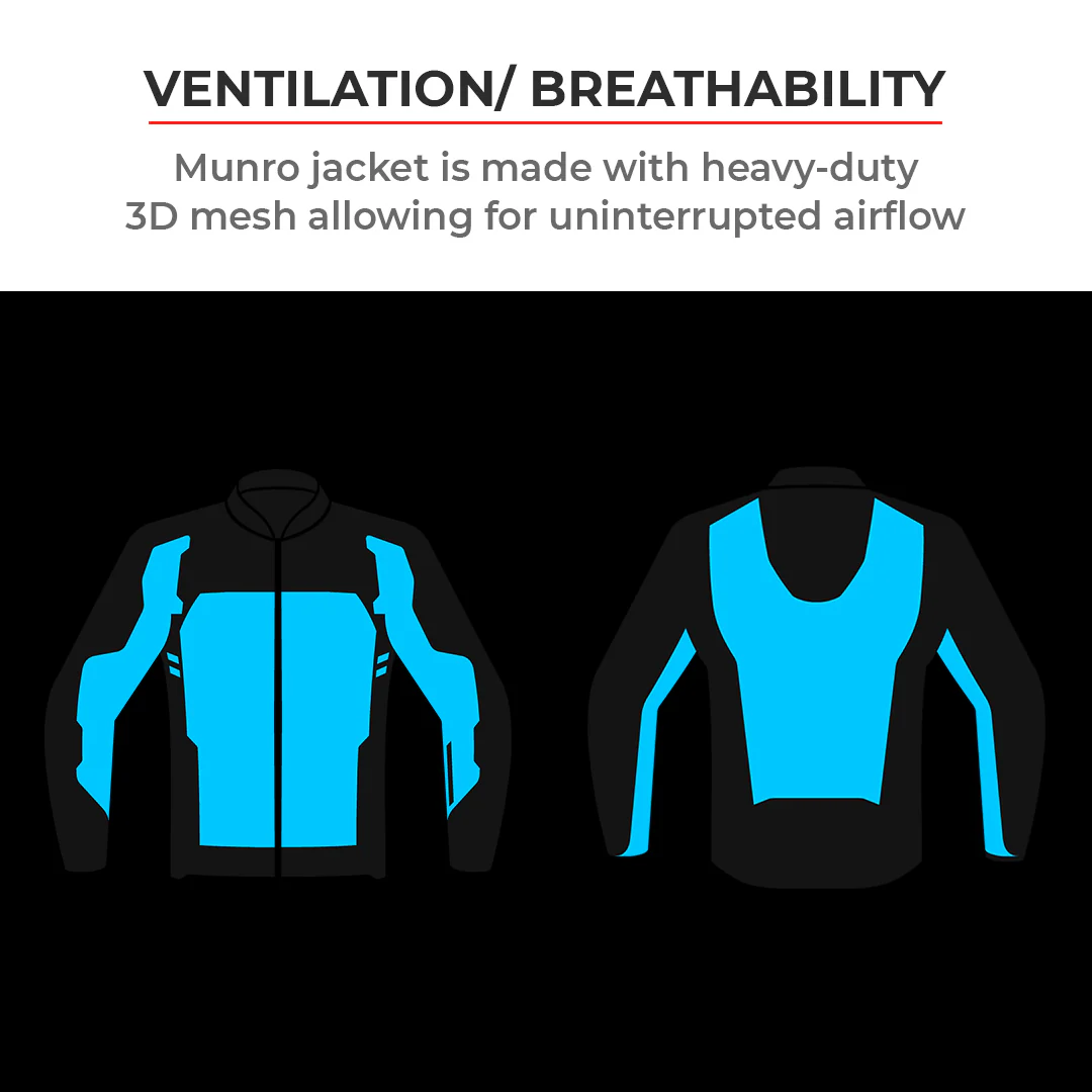 A3: The Munro features a high-strength mesh and Cordura® outer shell, ideal for street and hot-weather riding. For rain or cold weather, an external waterproof or thermal layer is recommended.